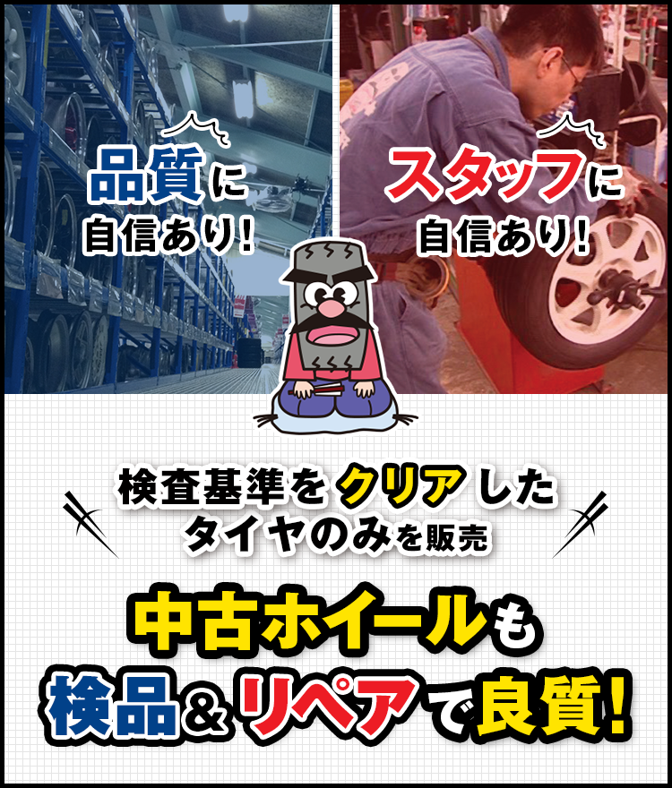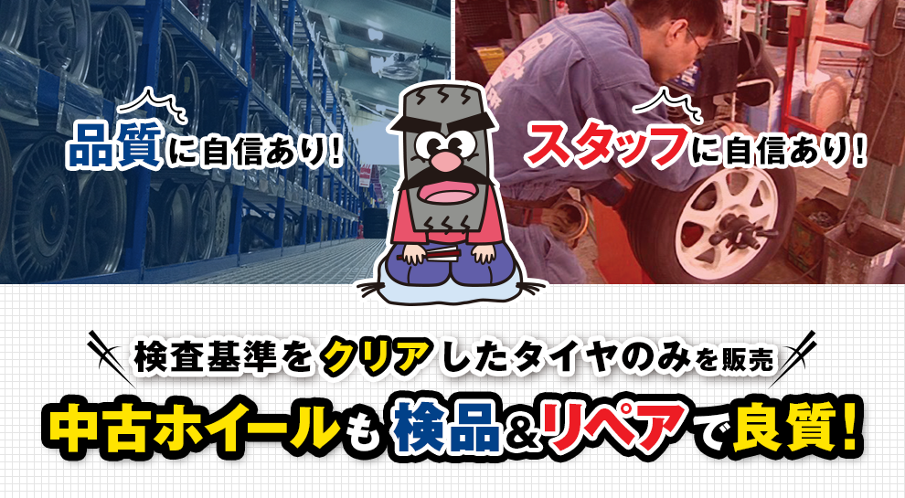 しかし1本から買える・価格の安さ・中古ながら新品同様などのメリットも多く、「車検まで持てばいい」という方にはお値打ち商品をご用意できるのも中古ならでは。また新品では見つからない、他店にないプレミアム性の高いものも中古品にはたくさんあります。当店はこれらのメリットを最大限に活かした中古タイヤ・中古ホイールをお客様にご提供できるようこころがけています。